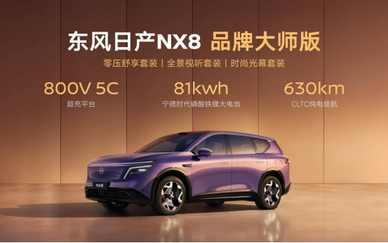 从研发到制造,东风日产23年来始终秉持精益求精的匠心精神。为了致敬同样追求卓越、在平凡领域中创造非凡的“大师级”用户,发布会上,东风日产NX8品牌大师版重磅登场。其搭载800V 5C超充技术、宁德时代81度大电池,纯电续航630公里。