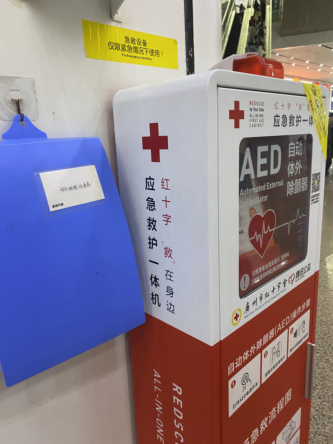 广州南站的AED设备旁,悬挂着“AED巡检记录表”