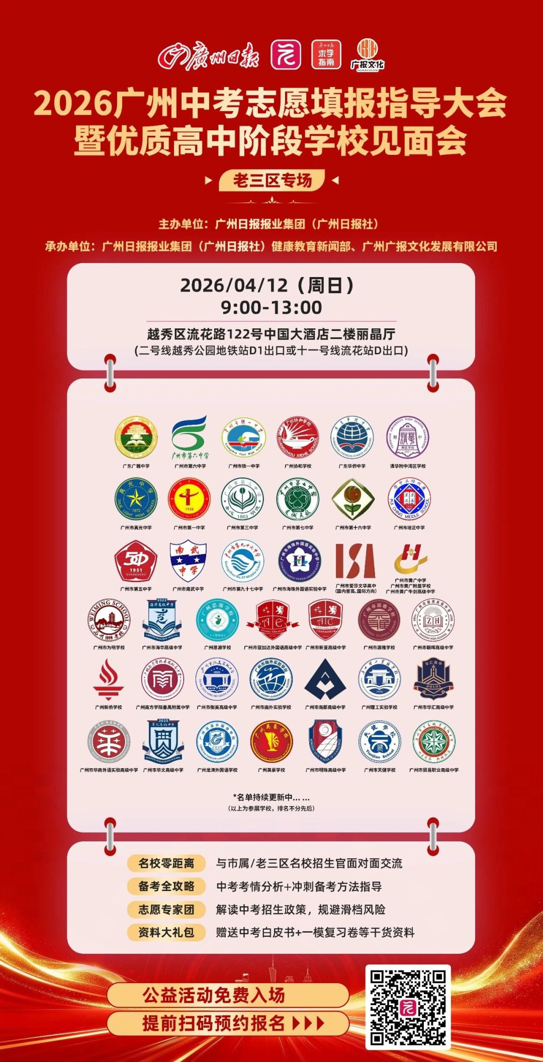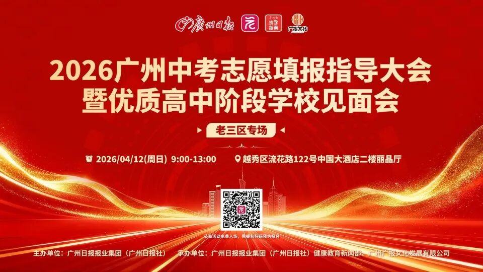 4月12日(周日)9:00—13:00,广州日报将在中国大酒店二楼丽晶厅举办“老三区中考咨询会”,汇聚近40所公办、民办热门高中,30位升学专家现场坐镇,一站式破解志愿填报难题,助力考生把握新政机遇。
