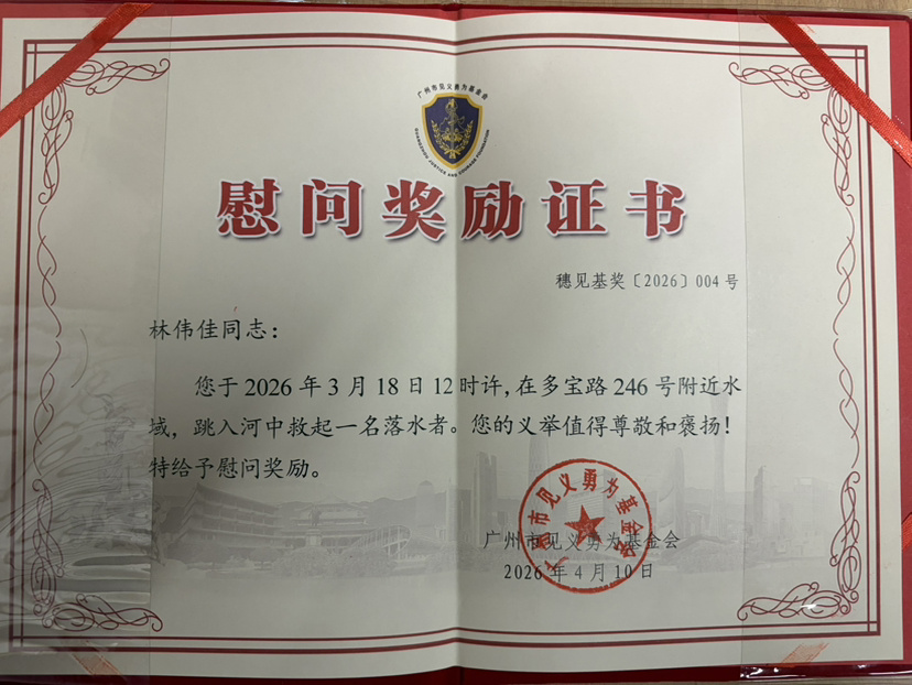 英雄城市,致敬英雄。4月10日,广州市见义勇为基金会举行2025年度“广州见义勇为好市民”“广州市见义勇为先进集体”暨2026年第一季度见义勇为人员慰问奖励活动。67位平民英雄登上领奖台接受嘉奖。他们之中,有纵身跳河救起落水者的长者,有机智劝下轻生者的英勇高中女生,有徒手托举救下卡窗幼童的热心邻居,有临危不惧为心脏骤停群众实施心肺复苏的退役军人,有在危急关头奋力扑灭废品站火情的医院职工……这些平民英雄虽然来自各行各业,但在别人身处危难之际,他们选择挺身而出、伸出援手,让英雄之光照亮你我、温暖羊城。
