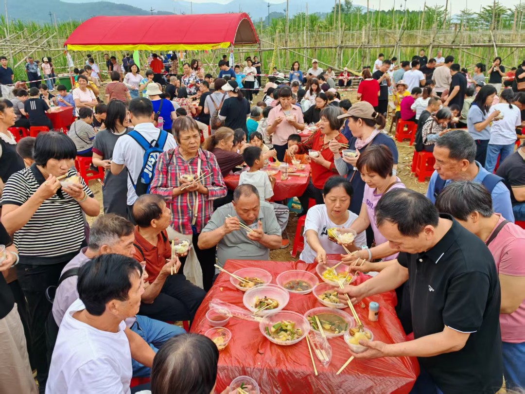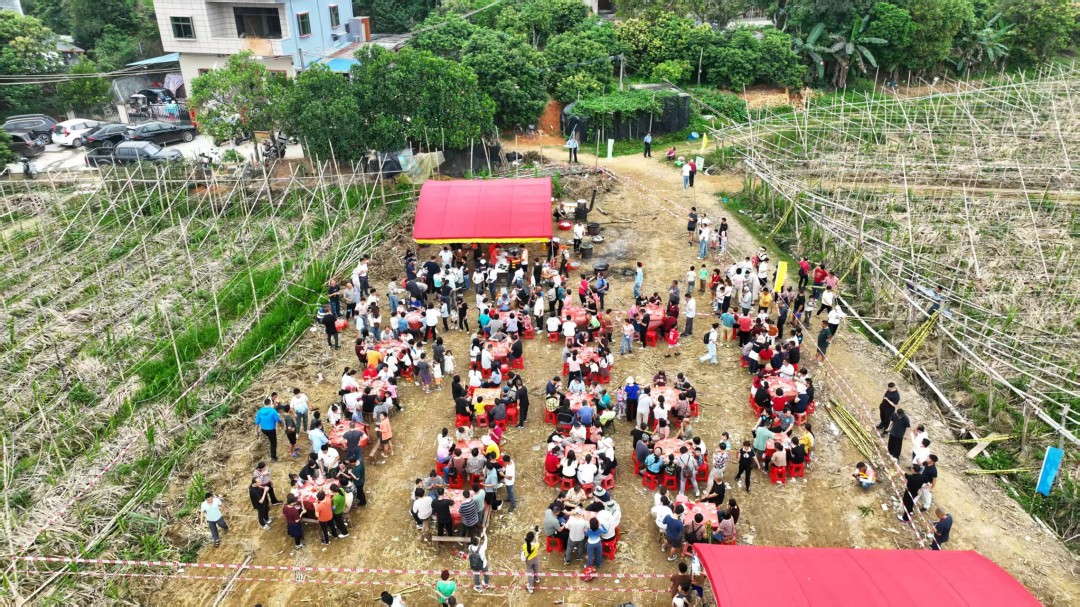 4月11日中午时分,增城区朱村街马车岭附近人声鼎沸,23围临时流水席在一片收割完毕的甘蔗地里依次摆开。