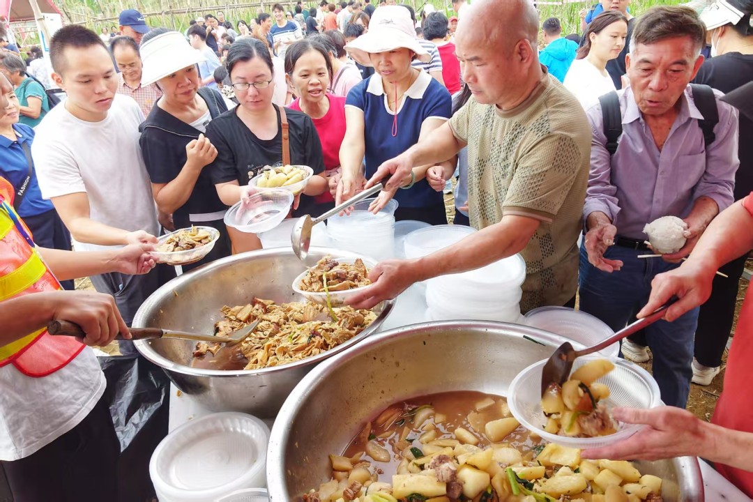 不远处,和附近村民组队吃“杀猪饭”的陈先生从新塘镇赶来,一边吃一边满意地点赞:“周末既得到了放松,又尝到了甘蔗,还吃上了美味的杀猪饭,一举三得。”