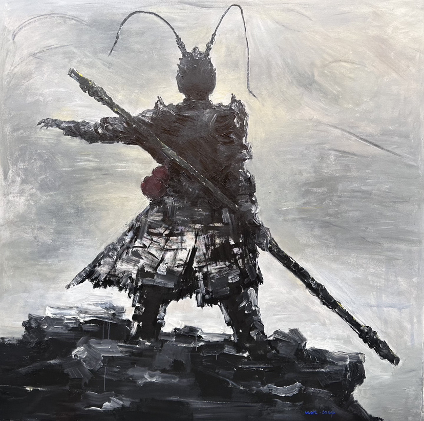 《蝶生》巨构之作是本次展览的核心作品,黑悟空金箍棒端的蝴蝶,是整幅作品的精神内核。“这只蝶,是每个暗夜前行者的‘曙光’,是历经黑暗后破土而出的希望,亦是自我救赎与蜕变的具象化表达。”吴小磊表示。