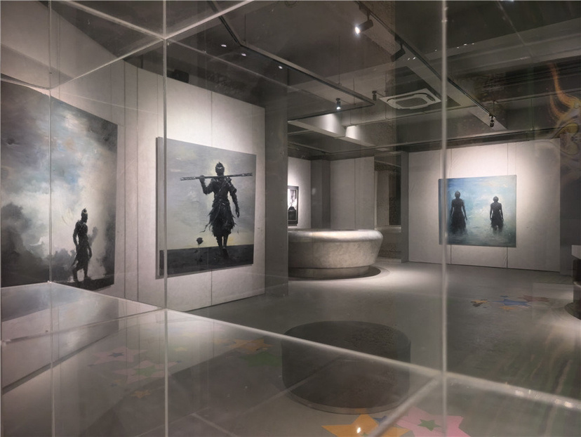 展览现场,艺术家吴小磊的《蝶生》《见我》《孤勇者》《战神与黑玫瑰》《且慢》等九幅作品陈列其间。这些作品将悟空的背影比作一面带有隐喻的“镜子”,让观展者通过这面“镜子”映照出现代个体在时代洪流中的存在状态。“这是一场‘看见自己’的叩问——你在看他的背影,他在等你的转身。”吴小磊说。