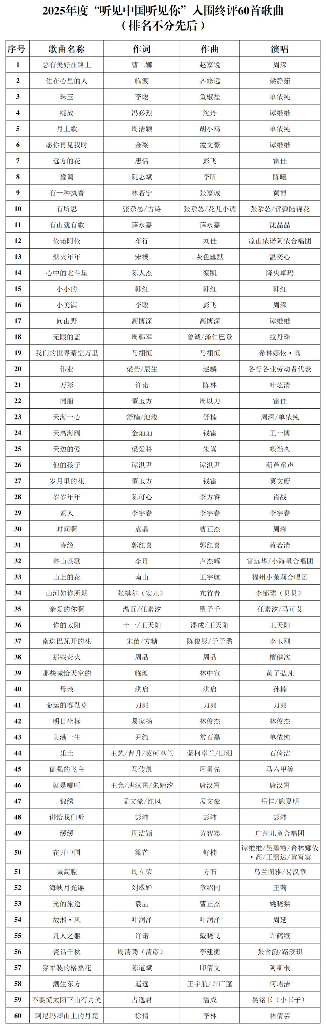 日前,中国音乐家协会公示2025年度“听见中国听见你”优秀歌曲推选复评结果。60首歌曲将角逐20首年度优秀歌曲和各单项荣誉。