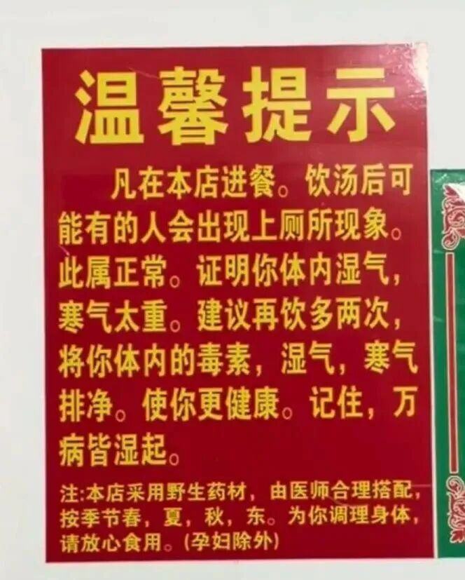 店家提示:“凡在本店内进餐,饮汤后可能有的人会出现上厕所现象,此属正常,这证明你体内湿气、寒气太重。建议再饮多两次,将你体内的毒素、湿气、寒气排净,使你更健康。记住,万病皆湿起。”