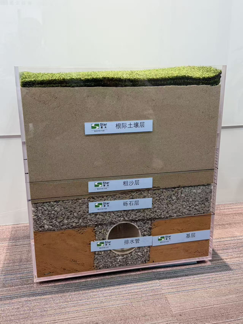 在广州星太体育场地设施工程有限公司,一个草坪模型揭示了专业运动草坪的剖面结构:草下依次铺设着根系土壤层、粗沙层、尼龙网隔离层、砾石层和素土层,总厚度约50厘米。