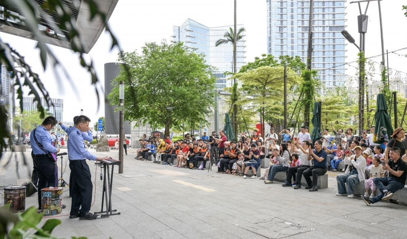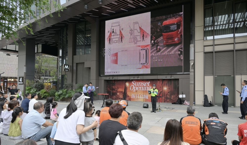 活动在激昂的旋律中拉开序幕。番禺公安“黑猫乐队”率先登场,演唱了流行歌曲和改编后的交通安全主题歌曲。来自淘宝闪送、美团、顺丰速运等企业的骑手、快递员、网约车司机代表等共同参与到活动中,不少途经的群众也自发加入,现场气氛热烈。