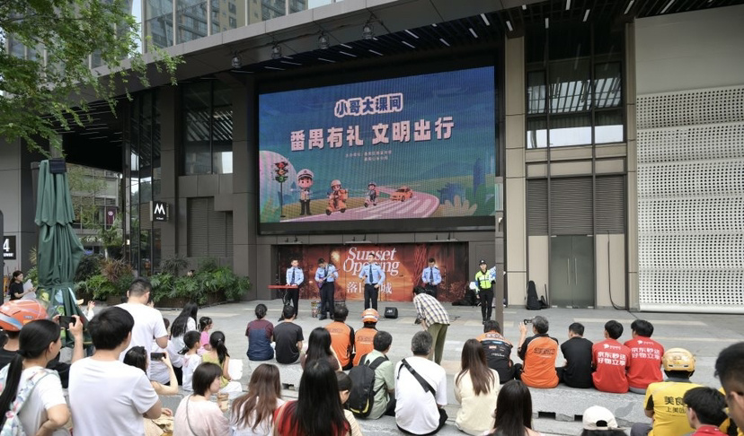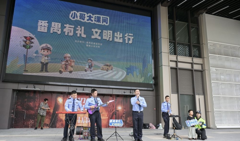 4月11日下午,广州市番禺区万博四海城小广场上响起激昂的乐队歌声。这是番禺区委宣传部联合区公安分局举办的首场“小哥大课间·番禺有礼 文明出行”快闪宣讲活动。活动针对外卖小哥、快递员、网约车司机等新就业群体,以乐队表演、专题宣讲、互动问答等形式,将一堂交通安全课“快闪”式送到新就业群体身边。