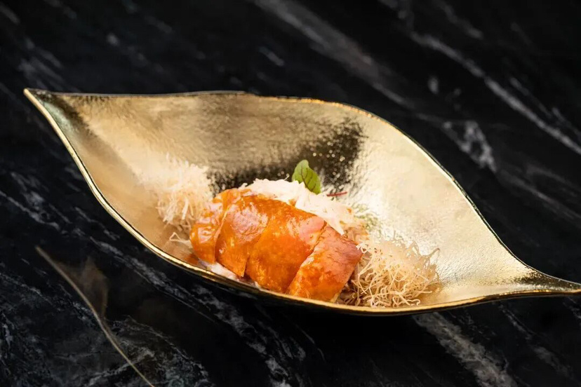 • 南沙金茂万豪酒店的“柚子脆皮手撕荔枝鸡”用明炉烤制,创新增添柚子果香,金黄酥脆外皮+酸甜鸡肉,层次感绝妙;