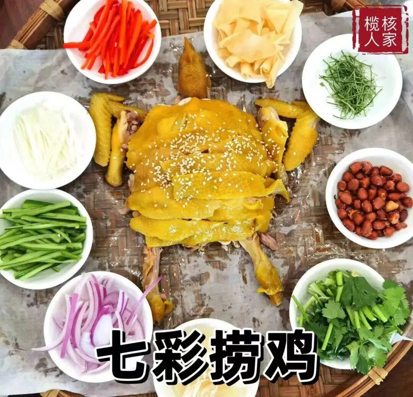 榄核人家的镇店招牌“七彩捞鸡”,将鸡煮熟后手撕成丝,再将各种配菜和调料与鸡丝混合,通过“捞”的方式搅拌均匀,使食材充分融合。