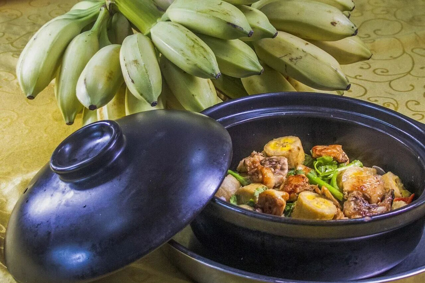 选用本地特产的大蕉,以其独特的微酸与清香中和鸡肉油脂的油腻,达到绝妙平衡。此时大蕉的口感跟平时完全不同,像淮山、土豆这类食材,却又不尽相同,口感比较特别,细细品味,还能咀嚼出鲜美香甜的鸡肉味。