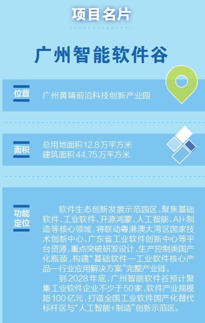 到2028年底,广州智能软件谷预计聚集工业软件企业不少于50家,软件产业规模超100亿元,打造全国工业软件国产化替代标杆区与“人工智能+制造”创新示范区。