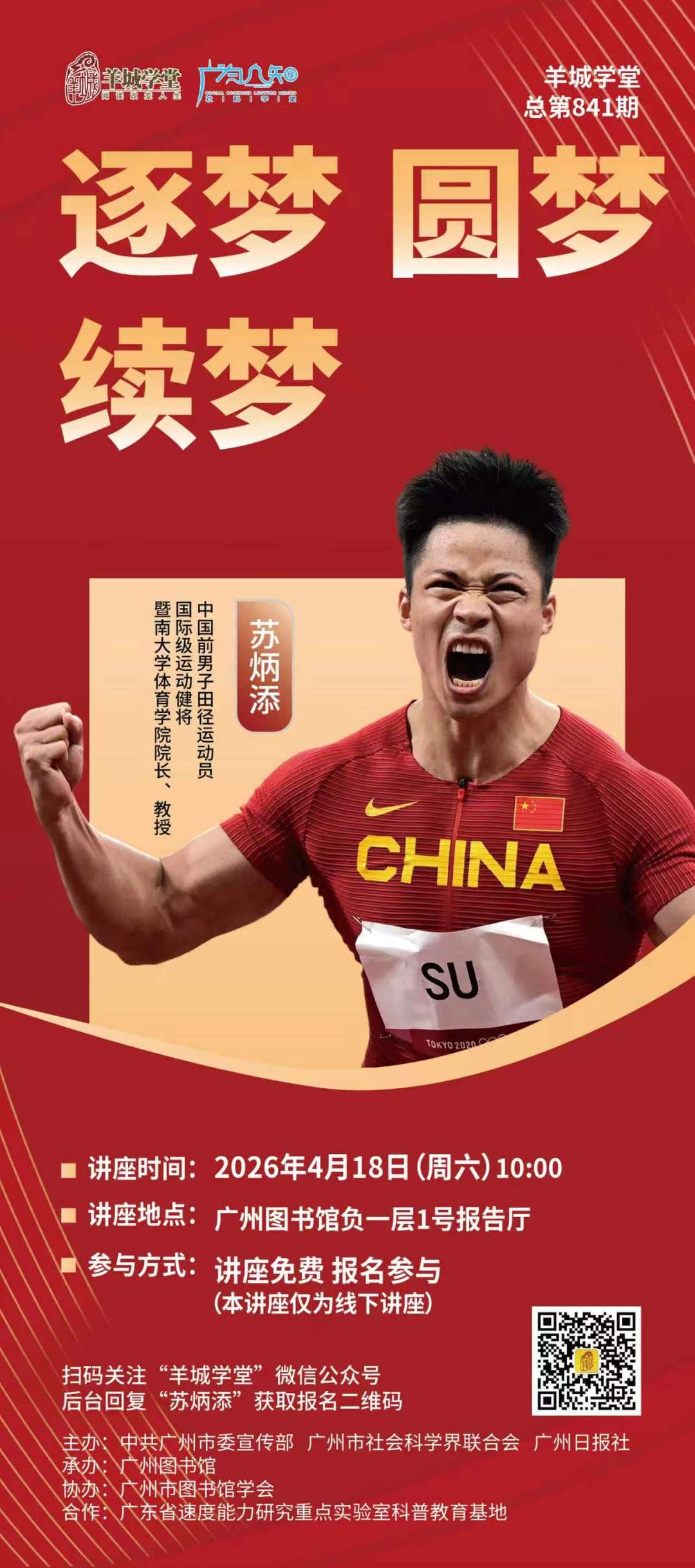 4月18日上午,暨南大学体育学院院长、教授、中国田径协会副主席、广东省田径协会会长苏炳添将作客羊城学堂,讲述自己从赛场到讲台,从运动员到教学者的逐梦、圆梦与续梦的精彩故事。