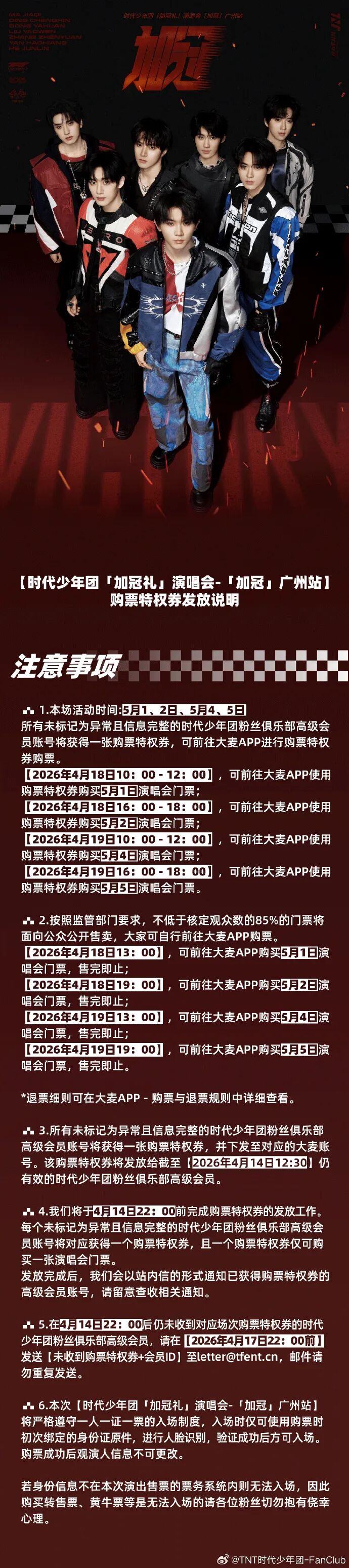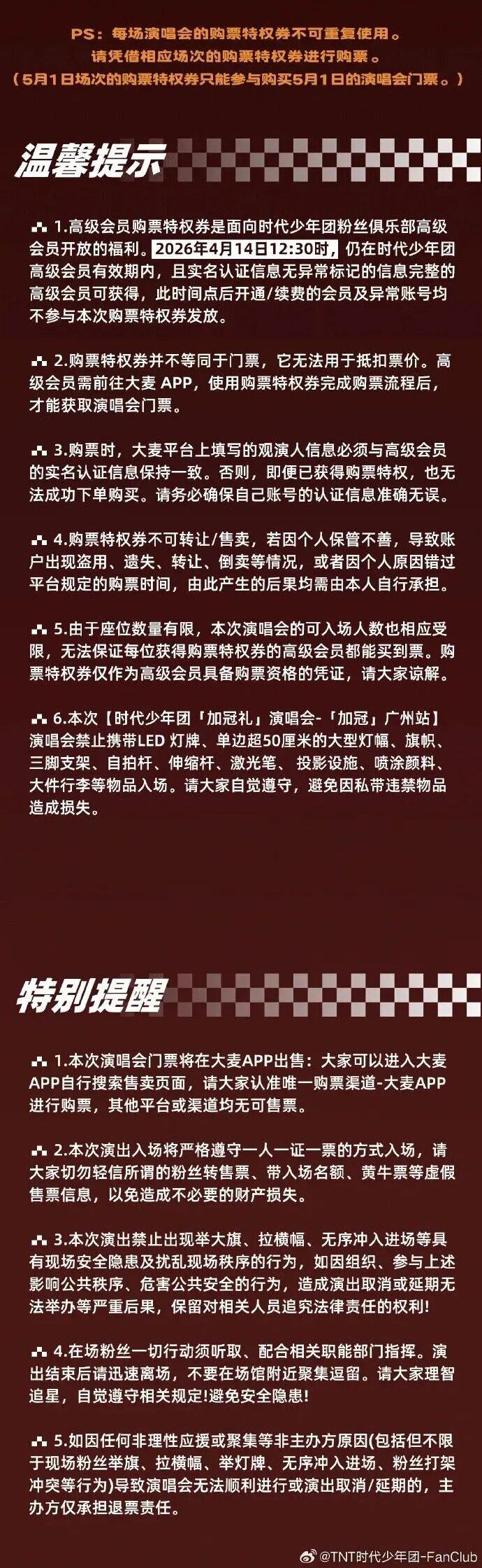 1、截至4月14日12:30仍有效的未标记为异常且信息完整的时代少年团粉丝俱乐部高级会员账号均可获得购票特权券,每场演唱会的购票特权券不可重复使用。请凭借相应场次的购票特权券购票。(例如:5月1日场次的购票特权券只能用于购买5月1日的演唱会门票。)