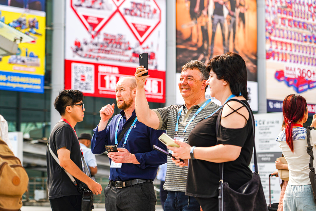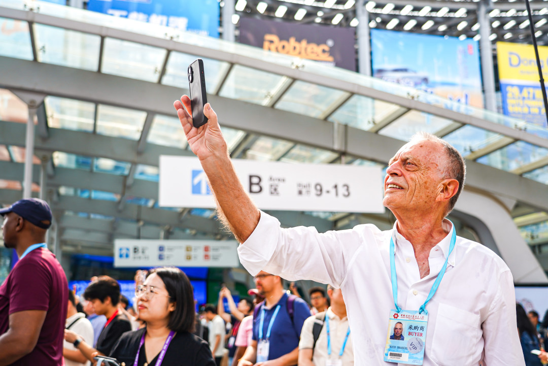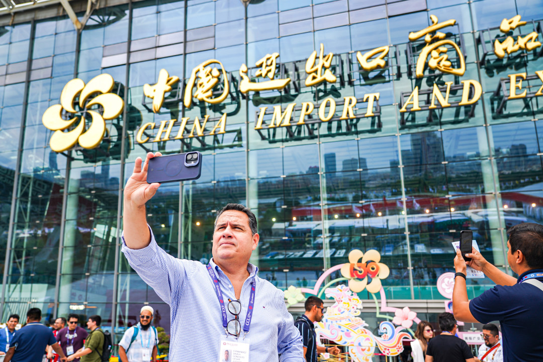 图为采购商在广交会展馆前拍照。