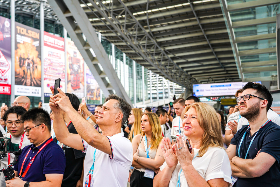 采购商被开幕仪式的表演吸引拿出手机拍照。