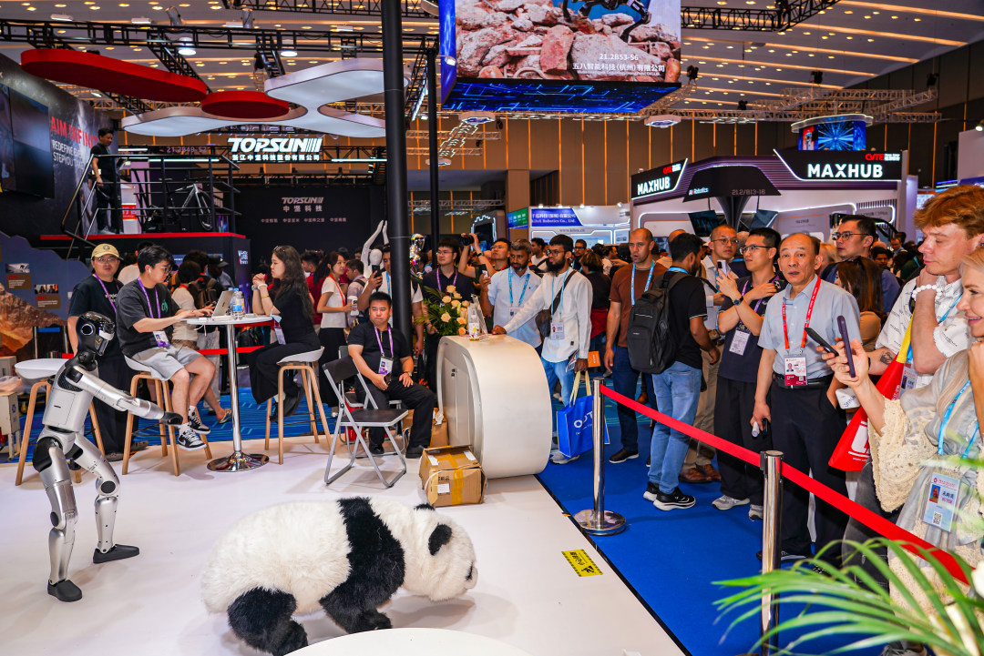 图为魔法原子的各种机器狗,包括一款以大熊猫为形象的机器狗,吸引采购商。