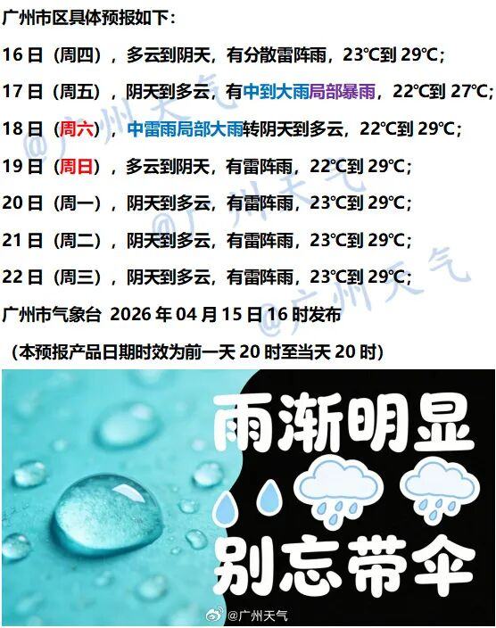 据@广州天气预报,从今天起,广州雷雨渐趋频繁,有中到大雨局部暴雨,并伴有短时强降水、8级左右雷雨大风等强对流天气,大家别忘记出门一定要带伞……