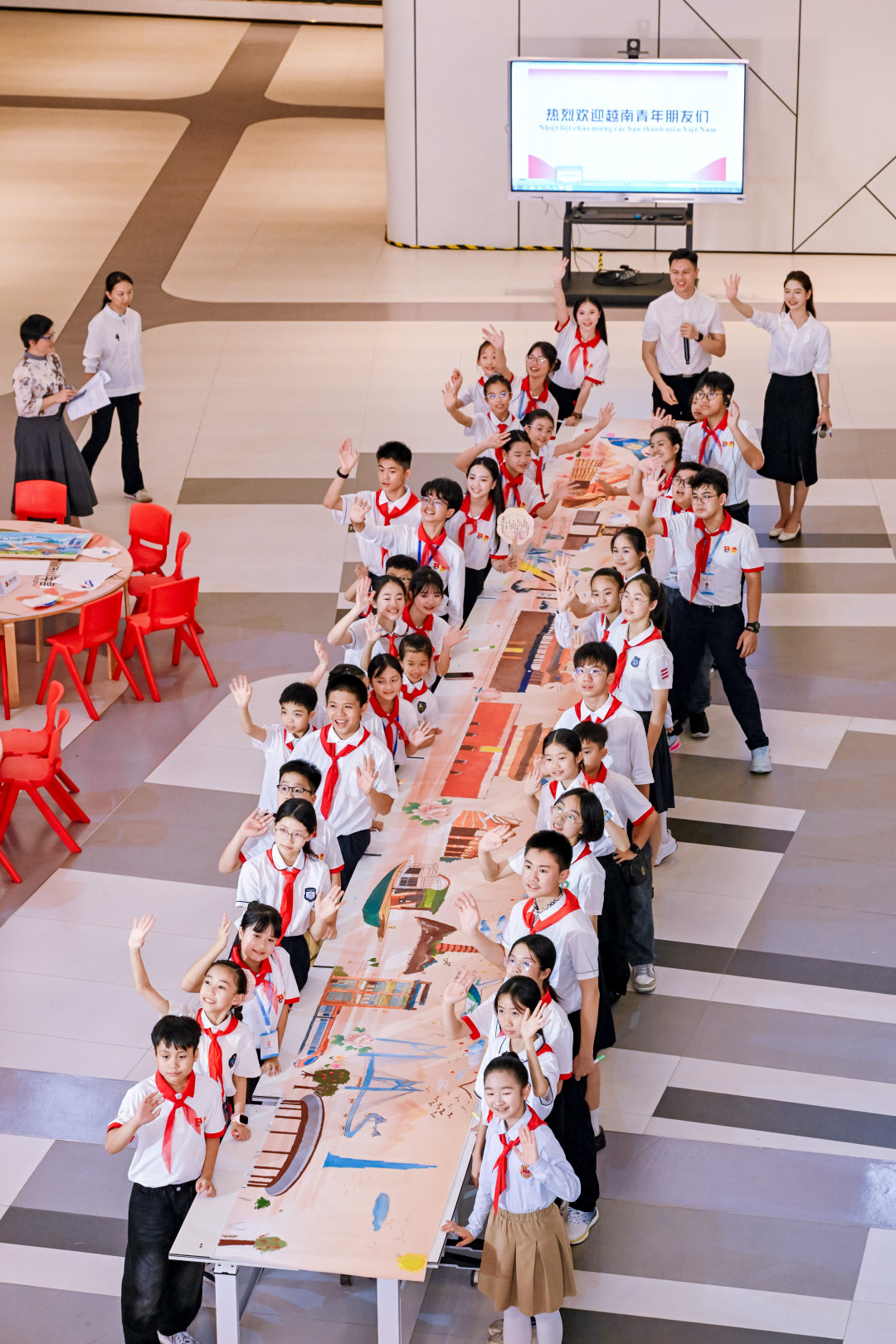4月12日晚,在广州市第三少年宫,“中越青少年共绘一幅画”活动将气氛推向高潮。38名中越少年分成6组,用画笔共同描绘中越友好与红色记忆。从学习用对方语言呼喊分组序号,到一笔一画勾勒长城与国旗,再到在作品后郑重签下名字,两个小时的创作,让语言隔阂消融于色彩之中。“一起画画的时光太开心了,虽然语言不通,但我们用画笔和眼神就能交流!”一位越南队员拿着作品说,这将是她此行最珍贵的礼物。