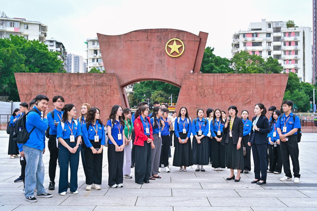 位于文明路的越南青年革命同志会旧址,是此行红色研学的核心坐标。百年前,胡志明同志在这里创办越南第一份传播马克思列宁主义的报纸《青年》,举办政治训练班,为越南共产党成立奠定基础。周恩来、刘少奇、陈延年等中国共产党早期领导人曾应邀授课。越南青年们在一楼展览和三楼复原陈列间流连,在胡志明同志曾使用过的物品前拍照,在授课模拟场景里留下身影。艺术分团的青年阮如宝感慨:“从课本上的故事到眼前的实物,革命前辈为了共同理想奋斗的艰辛与坚定,让我有了无比真切的理解。这份用鲜血凝结的友谊,是我们必须继承的宝贵财富。”