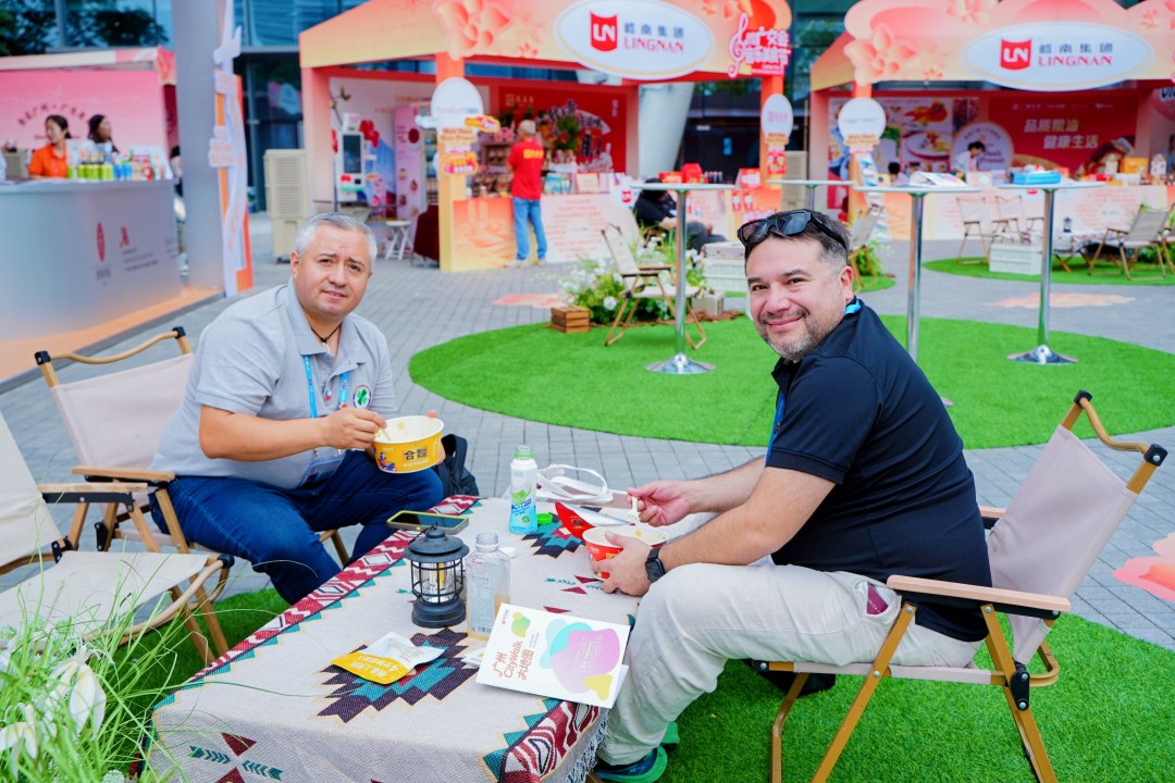 “Free Coffee,糯米糍”“食在广州,广交老友”“Hey Brother,饮凉茶”等押韵粤语教学吸引众多外宾现场尝试,在有得吃、有得玩的轻松氛围中,岭南文化的包容魅力悄然传递。
