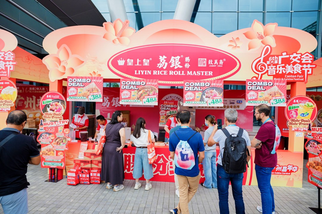 侨美食家传统西关濑粉、荔银肠粉广式和味牛腩猪肠粉、包道广式干蒸烧卖、包行天下老面鲜肉小笼包等各色名菜同台争辉,满足广大客商味蕾……本届美食节汇聚超40家餐饮品牌,涵盖精品粤菜、老字号、国际品牌、非遗美食与地方特色,打造一站式逛吃体验新场景。还有常来小聚的桂姐豉油碌鹅、万豪酒店的山椒冷泡玫瑰茭白、半岛集团的香草汁煎鸡扒、玫瑰园餐厅的咖喱牛肉酱玉米饼塔可、南沙喜来登酒店定制的杏仁薄脆等菜品,将传统食材与现代烹饪理念结合,展现广州餐饮的创新活力。荔银肠粉创始人、广式肠粉技艺非遗代表性传承人何应斌表示,为了让外国客商更了解本地美食,荔银肠粉在现场带来现制产品展示。他表示,希望借助广交会这一平台,让更多海内外客商了解广式肠粉的制作工艺与品牌标准化能力。近年来,品牌在连锁化和供应链建设方面持续发力,希望通过更稳定的出品与管理体系拓展市场。