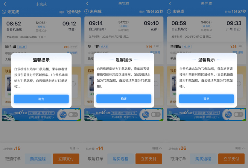 广州地铁还针对白云机场三座城际铁路车站的指引服务进行了优化,为方便旅客辨识白云机场三个航站楼、避免“误乘误下”,在铁路12306系统购票界面上线了提示功能。旅客在购买出发或到达城际白云机场东站(T3)、白云机场南站(T1)、白云机场北站(T2)的车票时,系统将在支付前自动弹出提示框,提醒所对应的航站楼。同时,广州地铁APP也同步优化了地图和“城际出行助手”中的站名显示,新增T3、T1、T2航站楼的标注。