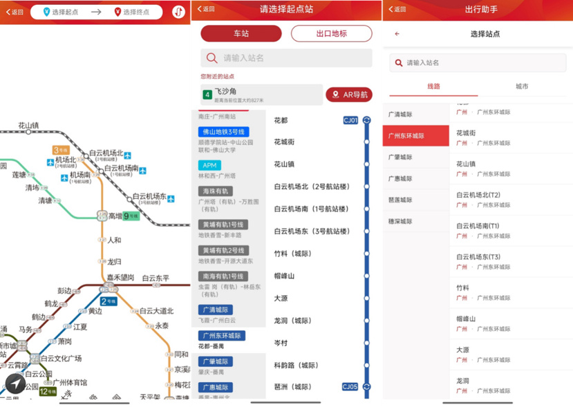 同时,优化了各平台白云机场东站、白云机场南站和白云机场北站的站名显示,新增T3、T1、T2的航站楼标注。此外,广州地铁APP及广东城际官方微信公众号的“城际出行助手”新增“站台显示”功能。