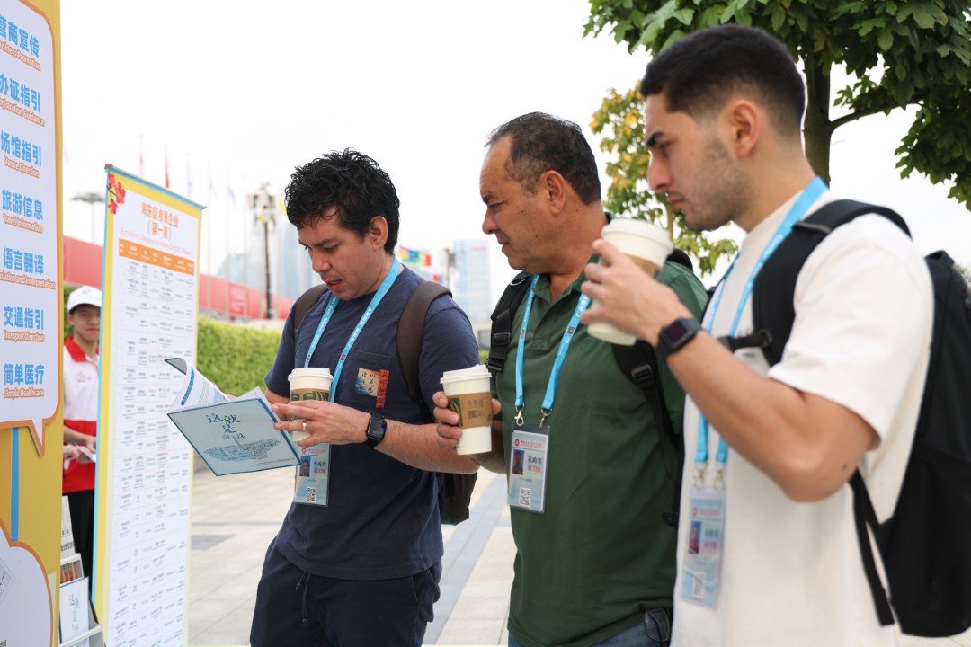 来自广东第二师范学院的谢芳芳服务于展会服务部,他表示:“首日服务期间,客商咨询量较大,问题多集中在展区指引、路线问询等方面。尽管忙碌且高强度,但每当看到中外客商满意的笑容、听到一句句真诚的感谢,所有辛劳与疲惫都化为满满的成就感。”