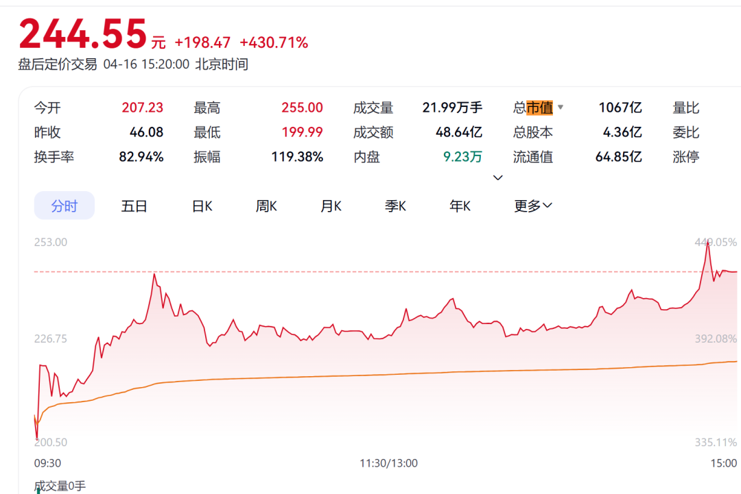 今日(4月16日),深圳大普微电子股份有限公司在创业板挂牌上市,开盘价报207.23元,较发行价46.08元大幅高开349.72%,盘中最高曾报255.00元,收盘价244.55元,涨幅达到430.71%,市值达到1067亿元。