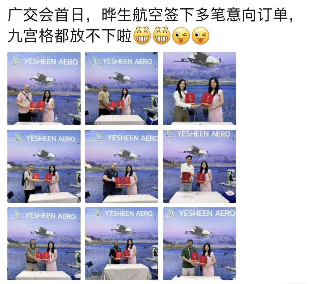 晔生航空董事总经理吴傲冰自豪地告诉记者,16日,新增八十架意向订单,而展会刚开幕首日,公司就签下 100 架意向订单,这两天意向订单总额超过1000万美金。企业还专门在展位设置签约台,现场签约仪式一场接一场,成果喜人。丰硕的签约战果,甚至让吴傲冰在朋友圈笑称:“广交会首日,晔生航空签下多笔意向订单,九宫格都放不下啦。”凭借过硬实力,吴傲冰还透露,不少客商已预约前往广州工厂实地考察。