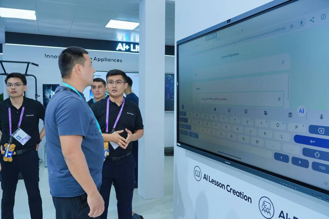 AI 技术不止深度融入家电,也正加速赋能教育领域。在其主展位,广州企业视源股份重点展示面向海外市场的MAXHUB人工智能教育及会议解决方案。其中,针对海外教育市场推出的多语种AI软件MAXHUB EasiClass,支持英、日、泰等13种语言环境。借助AI 课程生成器功能,老师只需输入一个简短的主题,不到2分钟,系统就能自动生成包含教学目标、案例和随堂测试的20-30页专业课件,可以直接用于课堂。