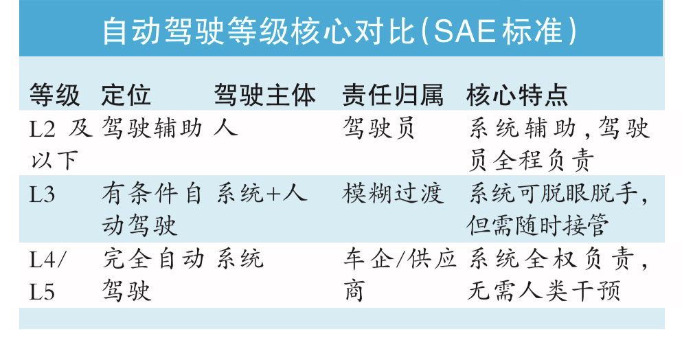 L3级自动驾驶是美国汽车工程师学会(SAE)J3016分级体系中的关键节点,我国自动驾驶分级基本参考该体系。从L0到L5,行业普遍认为数字越大能力越强,但这套体系的真正分水岭并非能力强弱,而是“责任划分”,这也是L3引发争议的核心原因。