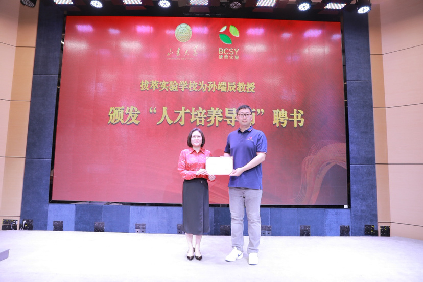活动现场,拔萃实验学校魏顺德主任首先宣读了《关于聘任山东大学数学学院专家为我校数学少科院人才培养导师的决定》。在热烈的掌声中,张娟红校长代表学校向山东大学数学学院孙端辰教授郑重颁发“人才培养导师”聘书,并赠送纪念品。