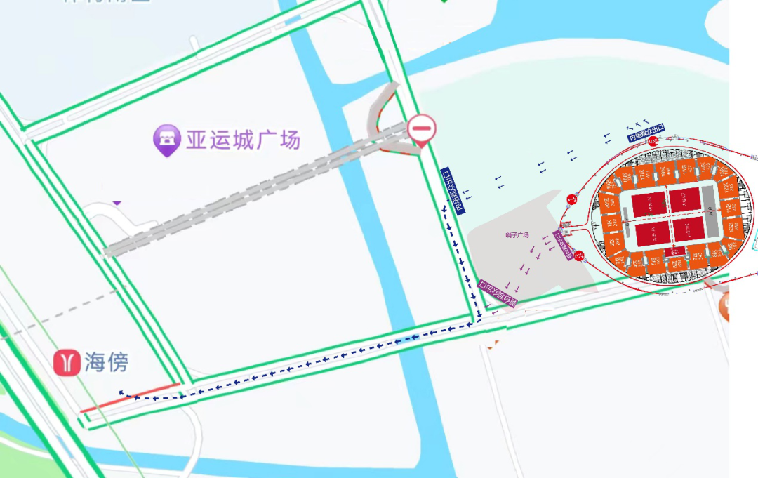 ②内场观众从5号、6号通道散场后往西广场方向走,穿过西广场出场馆,再从兴亚大道西门出口左转,途经亚运南路,往西步行至海傍站。