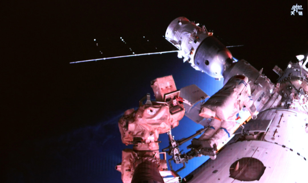 4月17日01时36分,经过约5.5小时的出舱活动,神舟二十一号乘组航天员张陆、武飞、张洪章密切协同,在空间站机械臂和地面科研人员的配合支持下,圆满完成空间碎片防护装置安装、舱外设备设施巡检等任务。出舱航天员张陆、武飞已安全返回问天实验舱,出舱活动取得圆满成功。