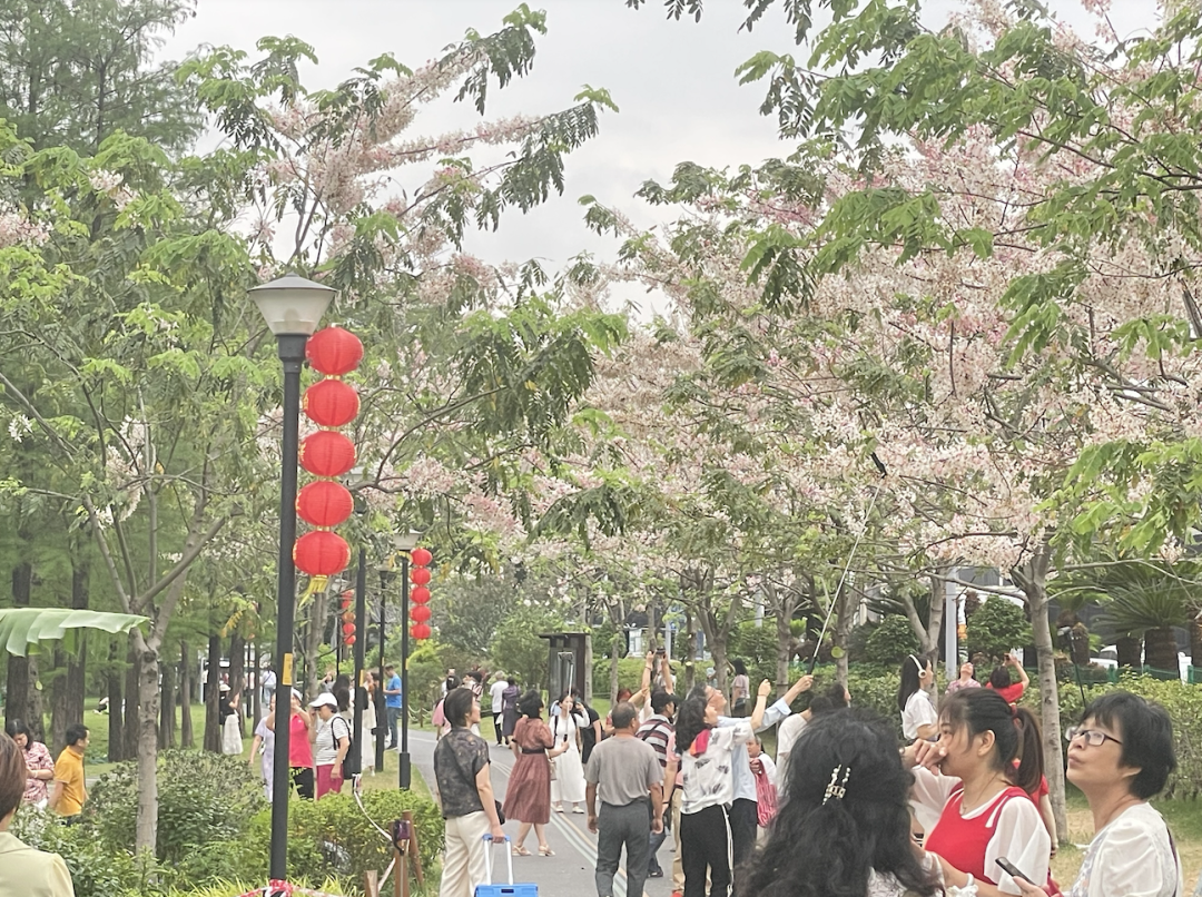 记者在现场看到,不少街坊已闻讯前来。有人举起手机定格美景,有人携家人漫步花径,一场以花为媒的温馨聚会正在温情上演。现场秩序井然,市民自觉文明赏花,共同守护这份美好景致。一位身穿浅色连衣裙的女生手举透明雨伞,模拟在花雨下漫步,定格唯美瞬间;还有市民开启直播,与网友分享这片粉色浪漫。
