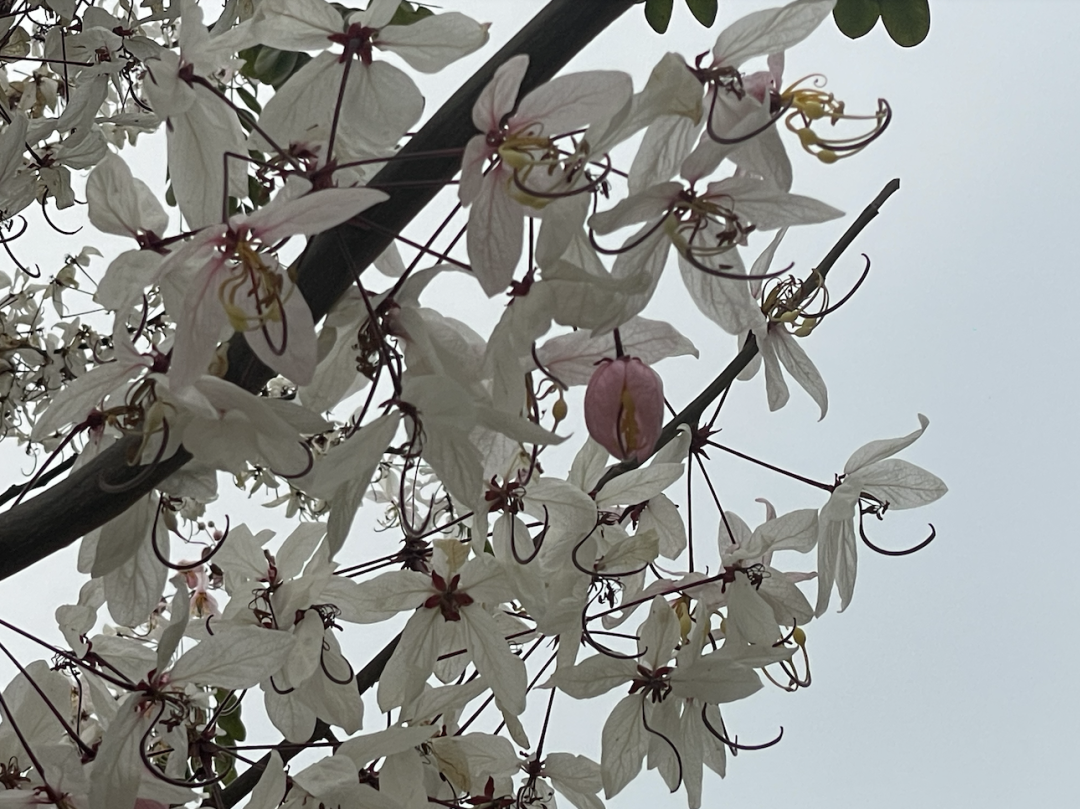 花旗木,又称绒果决明,属豆科腊肠树属植物,原产东南亚。其花形柔美、花色粉嫩,素有“泰国樱花”之称。与传统樱花相比,花旗木花瓣更修长,呈下垂姿态,宛如粉色流云挂在枝头,花心嫩黄色花蕊点缀其间,色彩层次更加丰富。更重要的是,它的花期更为持久。