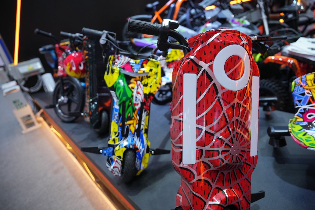 电动化不仅体现在技术上,也重塑着产品形态。深圳市开心电子有限公司展位上,一款酷似机器人的概念设计电动滑板车引人注目——它采用伸缩折叠结构,可轻松放入汽车后备箱,搭载1100W强劲电机,最高时速40KM/H,续航达100KM,满足长距离通勤需求。