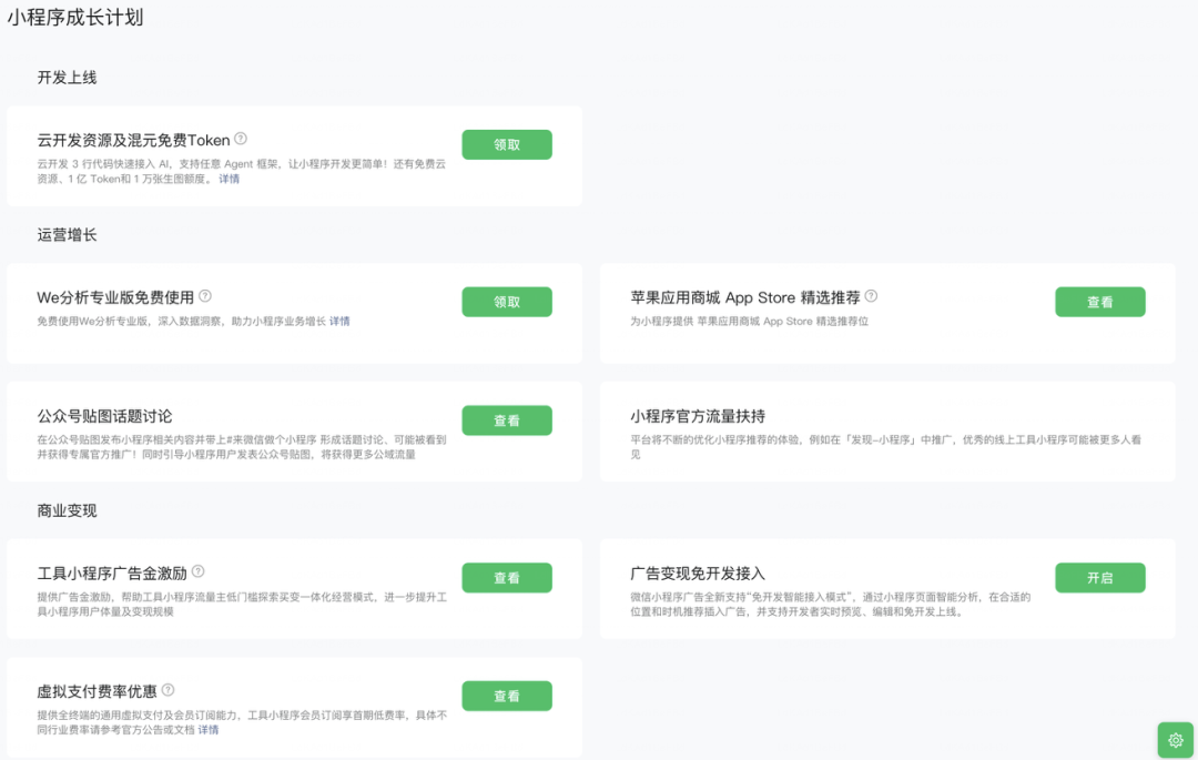 具体来看,此次升级最核心的变化是:面向所有小程序类目开放。所有开发者都可以申请包含免费云开发环境、1亿大模型Token、无门槛广告接入、优势虚拟支付费率在内的“AI大礼包”。