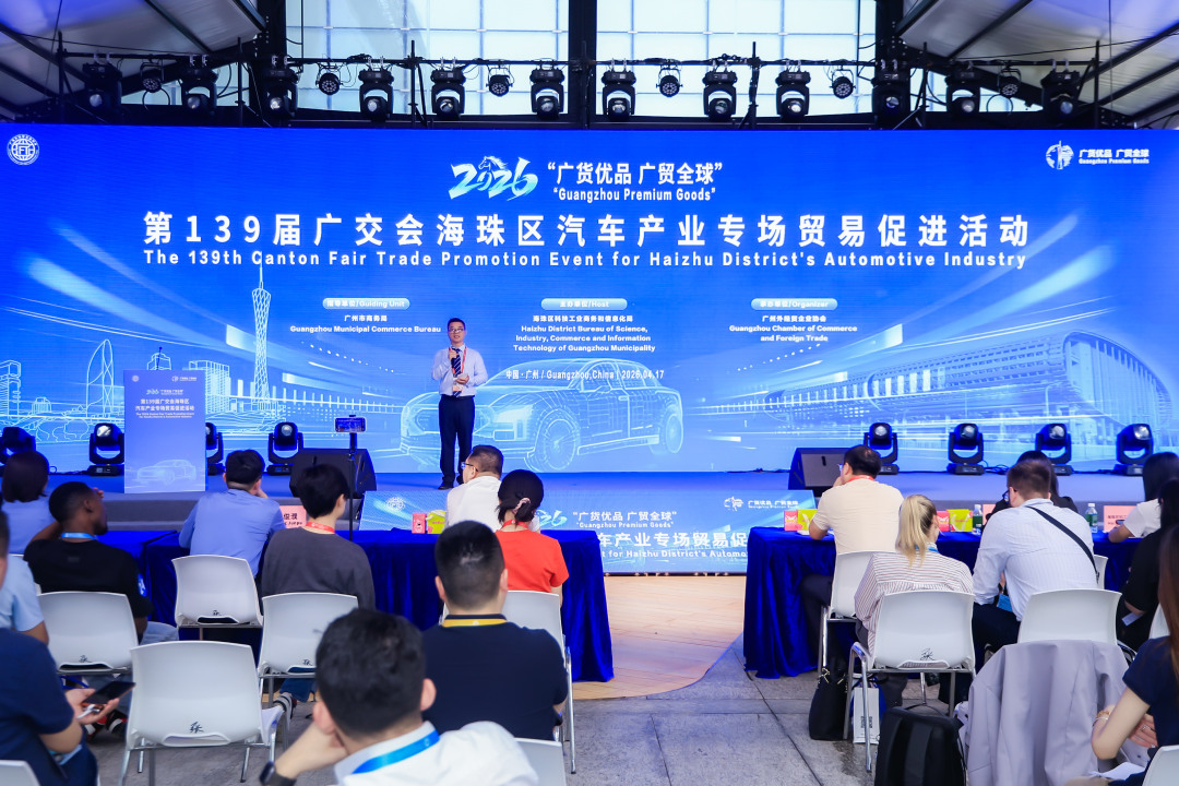 4月17日下午,广州市商务局指导,海珠区科技工业商务和信息化局主办,广州外经贸企业协会承办的“广货优品 广贸全球”第139届广交会海珠区汽车产业专场贸易促进活动,在广交会展馆A区中庭花园成功举办。此次活动是海珠区立足职能、精准施策,助力汽车产业“抱团出海”、拓展全球市场的重要举措,标志着海珠汽车出海工作按下“加速键”,为区域产业高质量发展注入新动能。