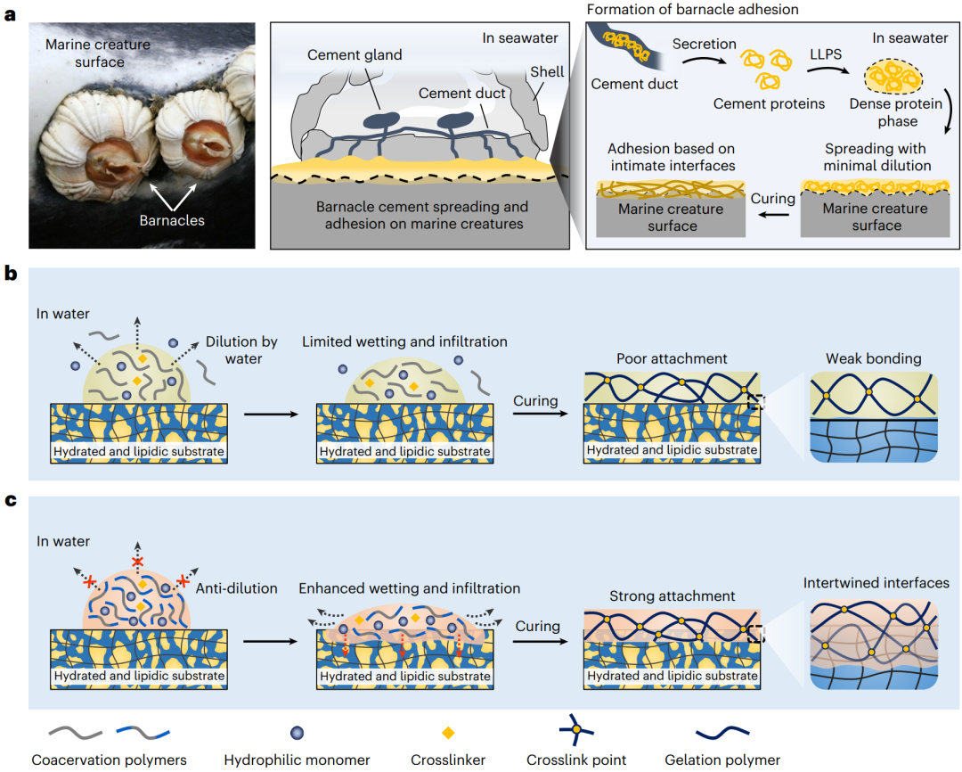 抗稀释、水下超铺展凝聚体通过模仿藤壶对海洋生物的粘附,以实现对含水及脂质基底的强效水下粘附