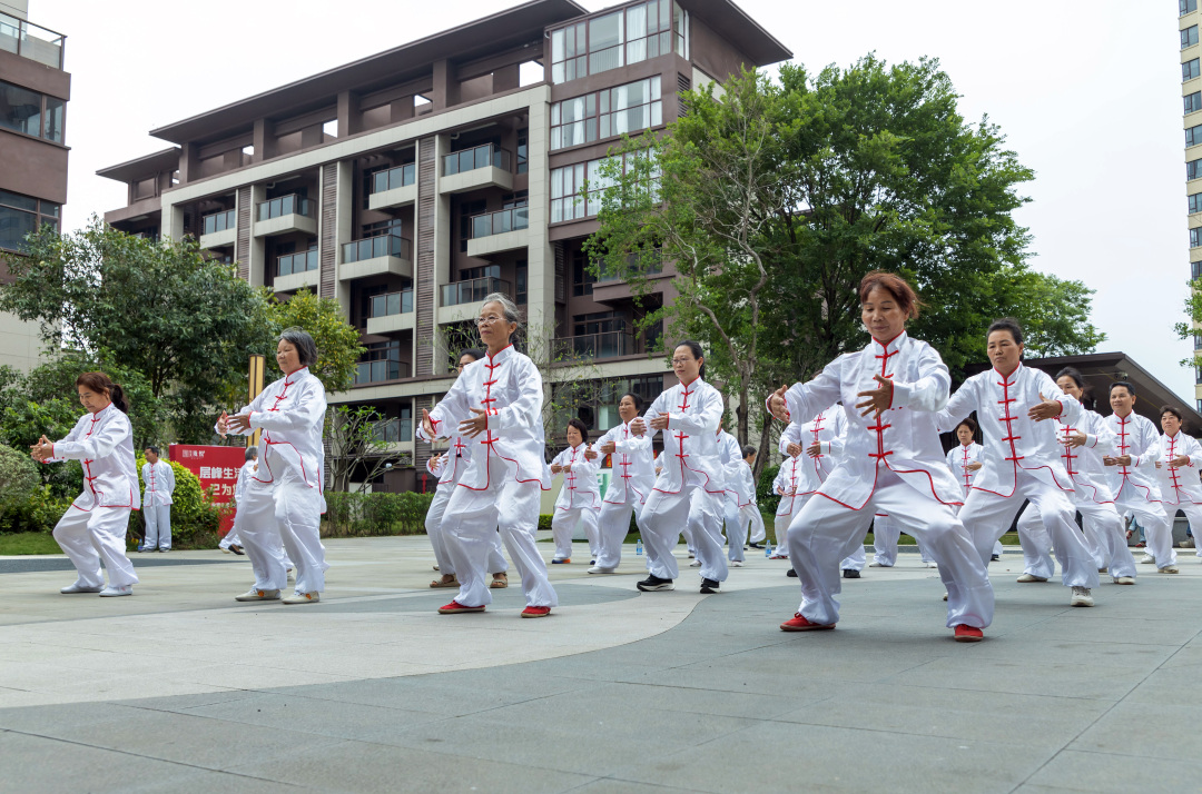 下午,志愿者化身带练员,在小区公园带领社区长者练习八段锦。8名志愿者分散队伍前方喊口令、慢示范,专业医师前排指导。“不要求动作标准,只要动起来、不出危险就行。”志愿者李阿姨一边扶着张婆婆做单举,一边鼓励大家。张婆婆随后主动要求加练说:“肩膀松快了。”