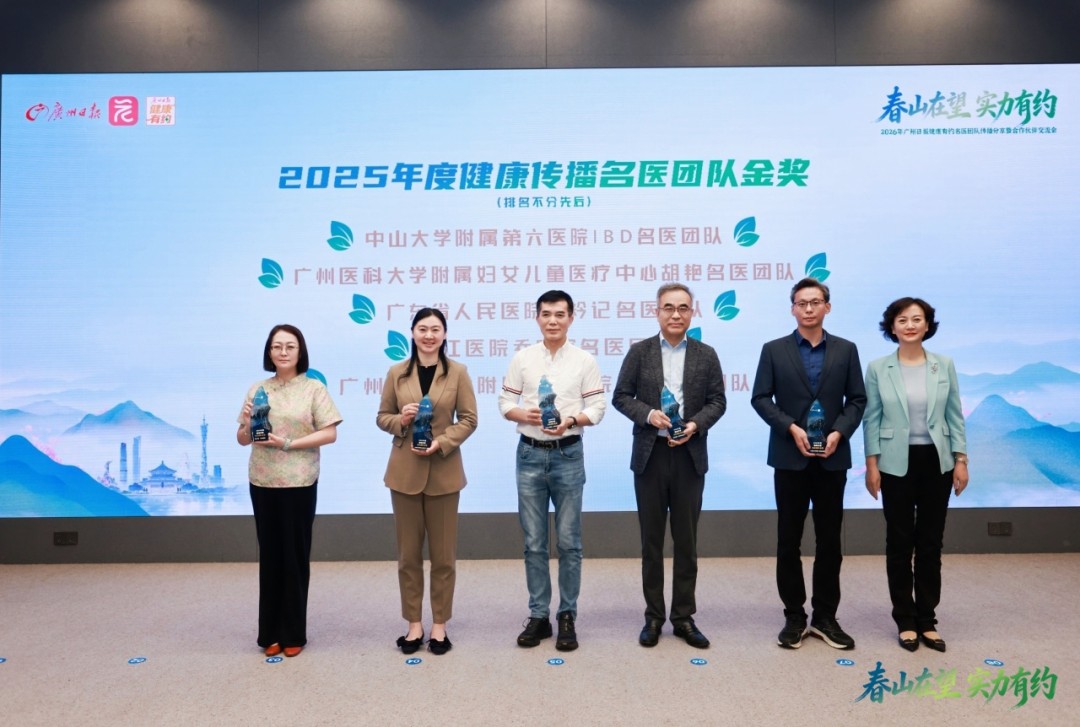 活动现场,广东省人民医院廖宁名医团队、中山大学附属大学第六医院IBD名医团队、广东省人民医院杨衿记名医团队、广州医科大学附属第一医院南山名医团队、广州医科大学附属市八医院肝病中心名医团队、广州医科大学附属妇女儿童医疗中心胡艳名医团队、珠江医院乔贵宾名医团队、南方医院陆云涛名医团队以及广州医科大学附属第二医院仁爱名医团队共9支名医团队荣获“年度健康传播名医团队金奖”。(完整表彰名单见文末)。