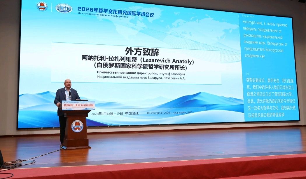 4月18日,2026年哲学文化研究国际学术会议在岭南师范学院正式开幕。来自中国、白俄罗斯、俄罗斯、波兰四国的53位专家学者齐聚湛江,围绕“全球文明倡议与‘一带一路’倡议背景下的文化共存”核心主题,开展跨地域、跨文化、跨学科深度研讨,凝聚学术共识,助力欧亚人文交流与多边学术合作走深走实。