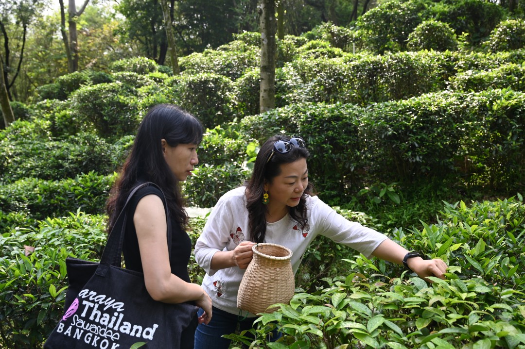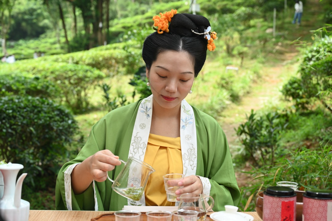 活动当天,茶趣园古乐悠扬、茶香四溢。在讲解员带领下,参与者漫步茶园,赏满目新绿,观看茶艺师现场演示采茶、制茶传统技艺,体验“陈皮茶养·岁时陈化”谷雨茶养席,品评谷雨春茶鲜爽甘醇的独特风味,为文艺创作汲取自然灵感。