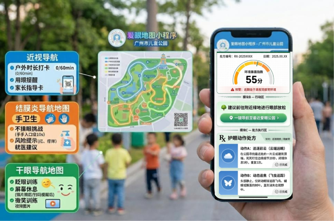 发布仪式上,中山大学中山眼科中心主任、医院院长林浩添教授介绍了“爱眼地图——智慧绿色行动”项目。这款由中大眼科中心与中大遥感学院联合研发的小程序,集户外打卡、用眼提醒、智能导航功能于一体,首期已上线广州市儿童公园专属路线,未来将逐步覆盖全市公园。小程序特别增设近视、结膜炎、干眼三项护眼专项指引,精准标注护眼互动区、远眺点、益眼植物观赏区,让市民在逛公园的日常中轻松实现科学护眼。