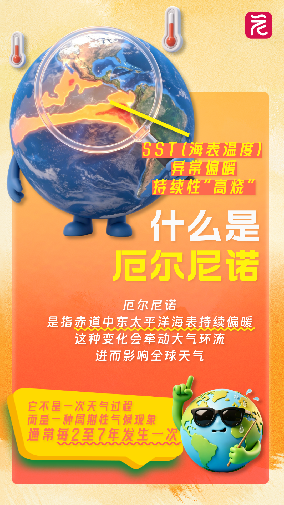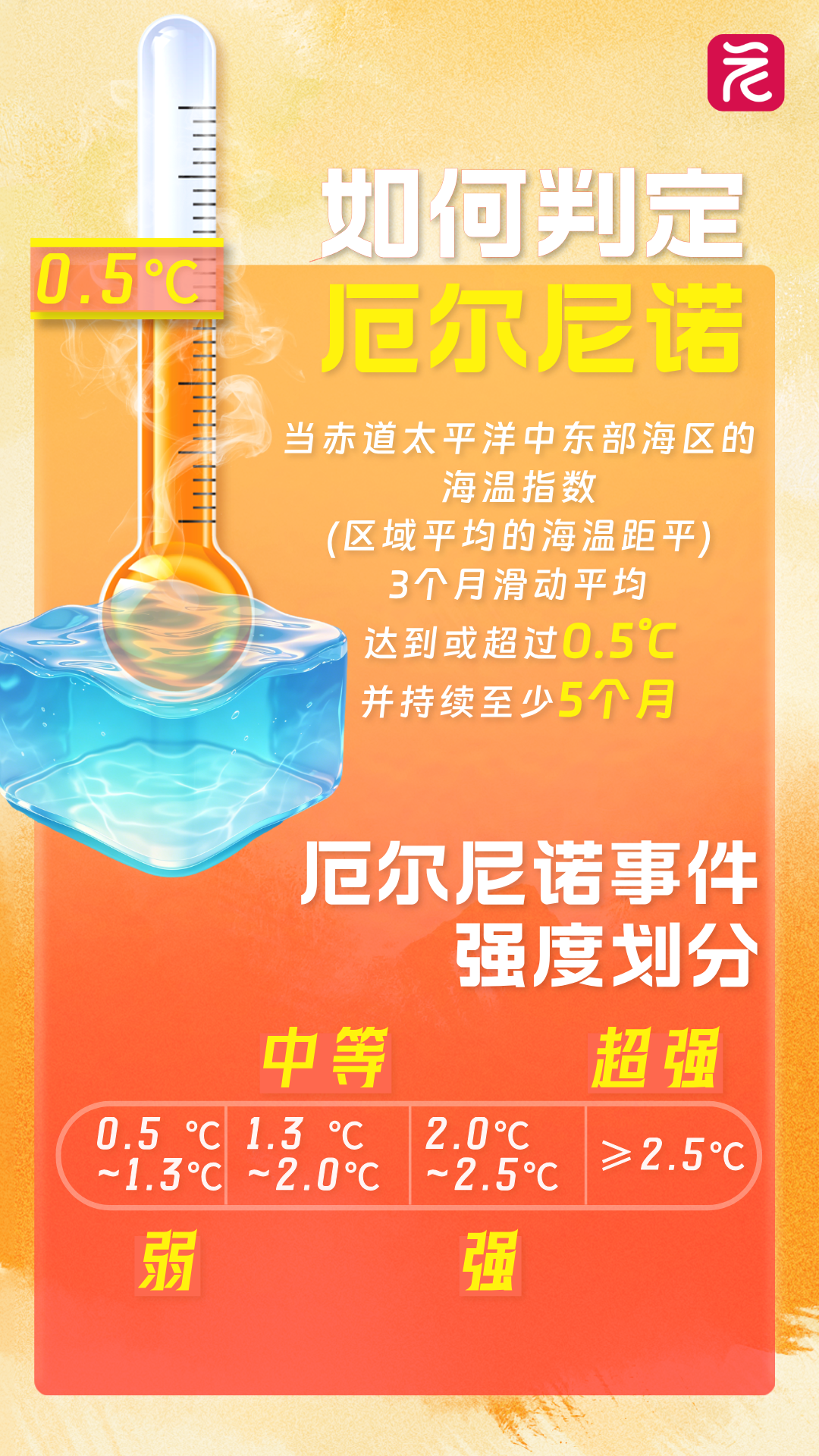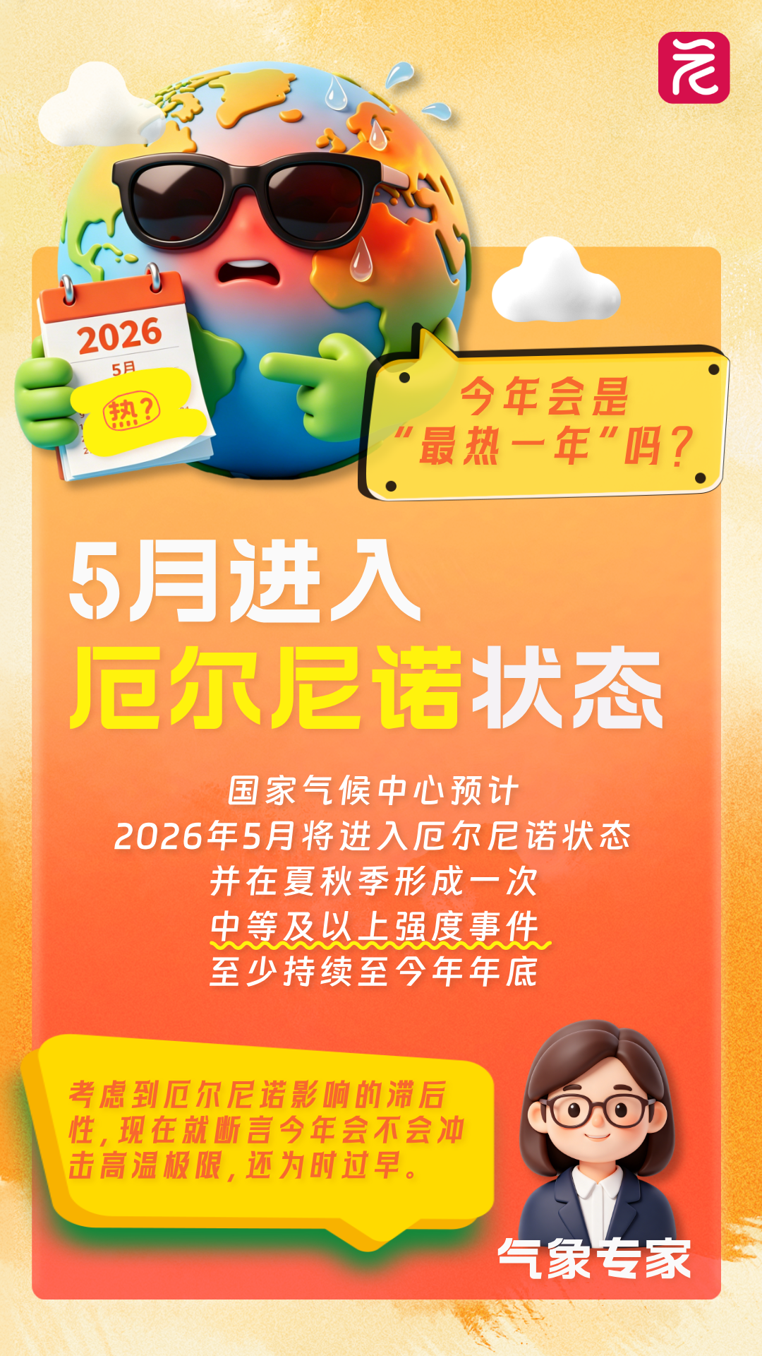 “140年以来最强级别厄尔尼诺要来了?”“今年会不会成最热一年?”最近,相关话题频频冲上热搜,国家气候中心最新预测显示,2026年5月将进入厄尔尼诺状态,并在夏秋季形成一次中等及以上强度事件,至少持续至今年年底。不过,专家也明确表示,考虑到厄尔尼诺影响的滞后性,现在就断言今年会不会冲击高温极限,还为时过早。厄尔尼诺到底是什么,如何判定,又会怎样影响天气?这组海报,带你一次看懂。