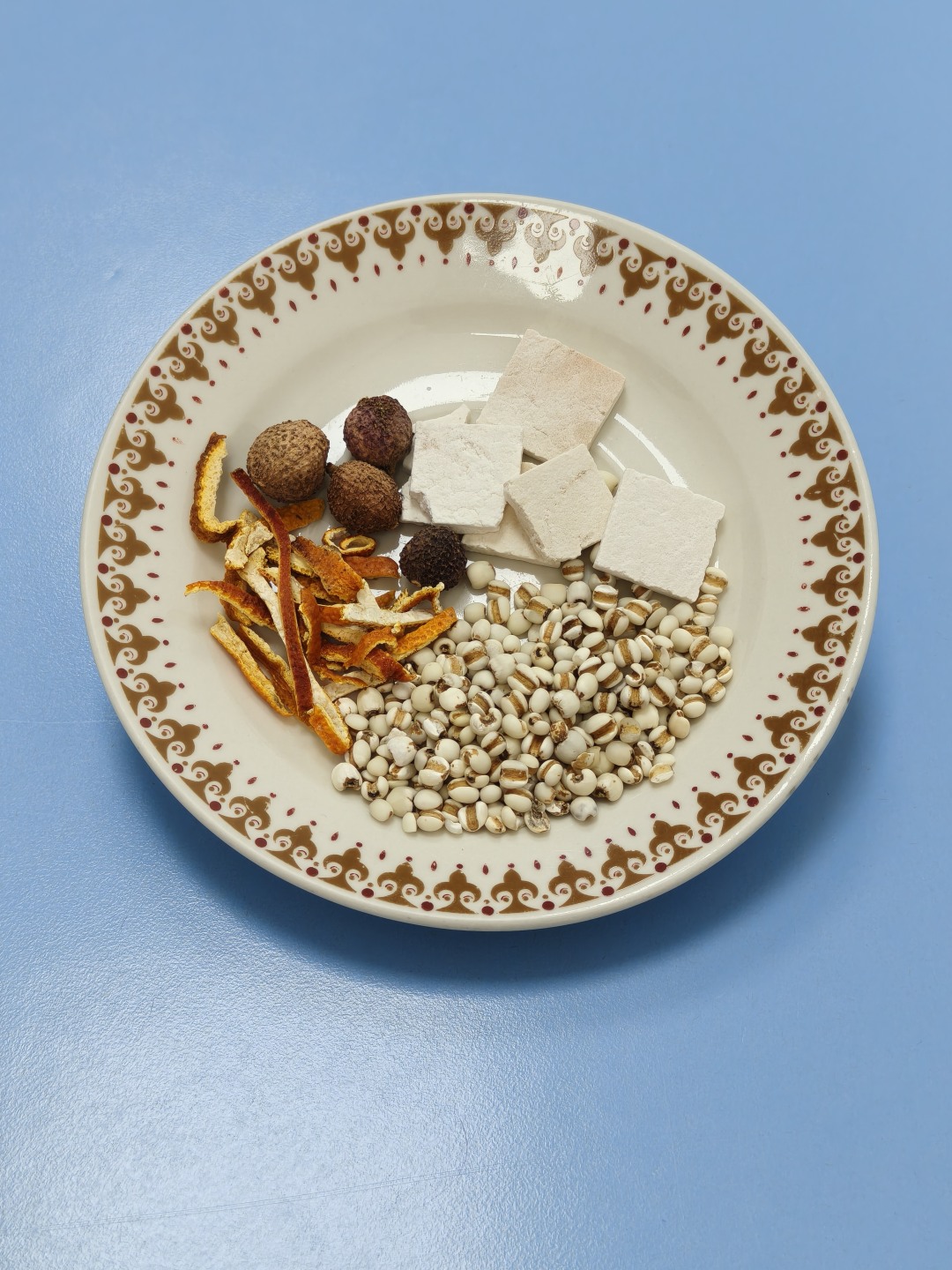 材料:茯苓10克、炒薏米15克、陈皮3~5克、春砂仁2~3粒(约3克)(1人份)